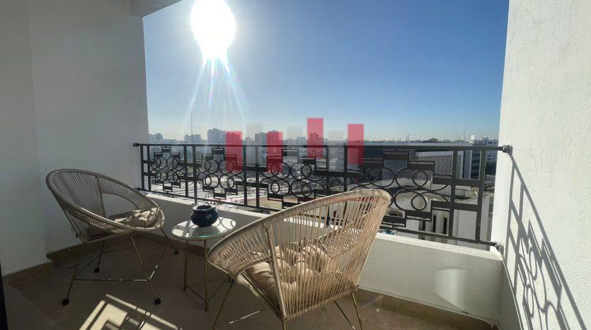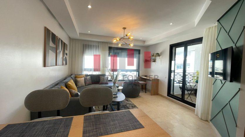 1 salon tres joliment meuble avec smart tele , internet et climatisation donnant un balcon