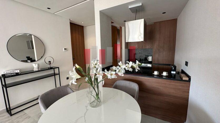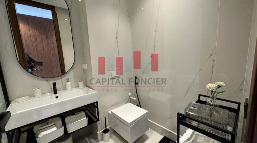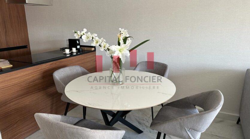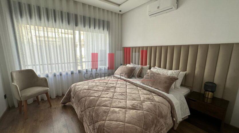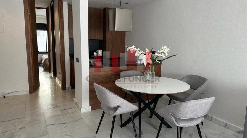 RACINE : Appartement neuf moderne totalement équipé d’une superficie de 60 m2 dont 6 m2 de balcon. Il se compose d’un salon, d’une cuisine américaine, d’une suite parentale avec dressing, d’une salle de bain, place de parking titrée, climatisation centralisée, a 2 pas du boulevard Massira.