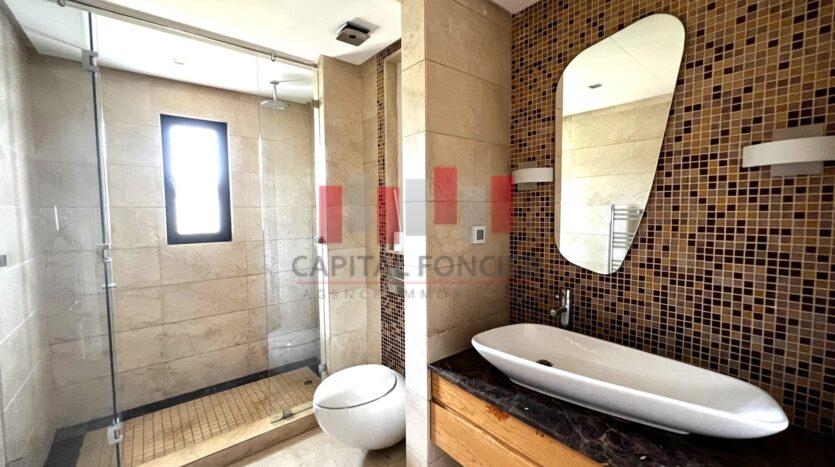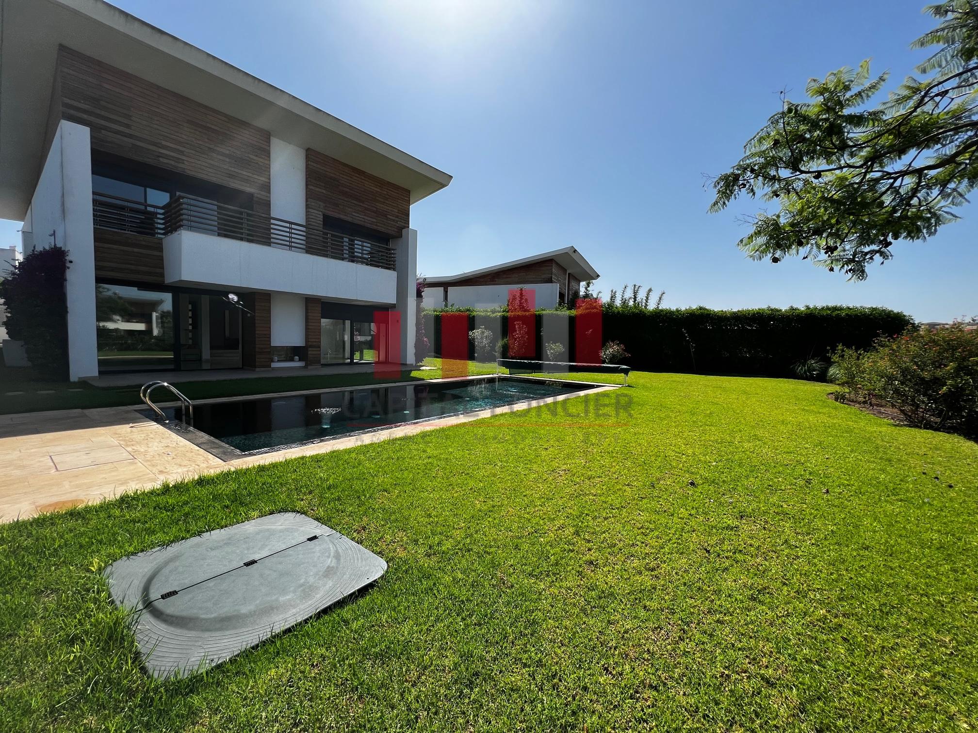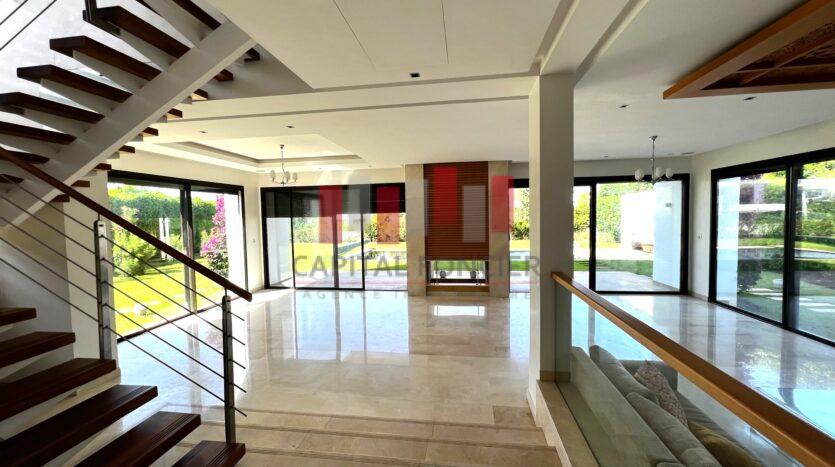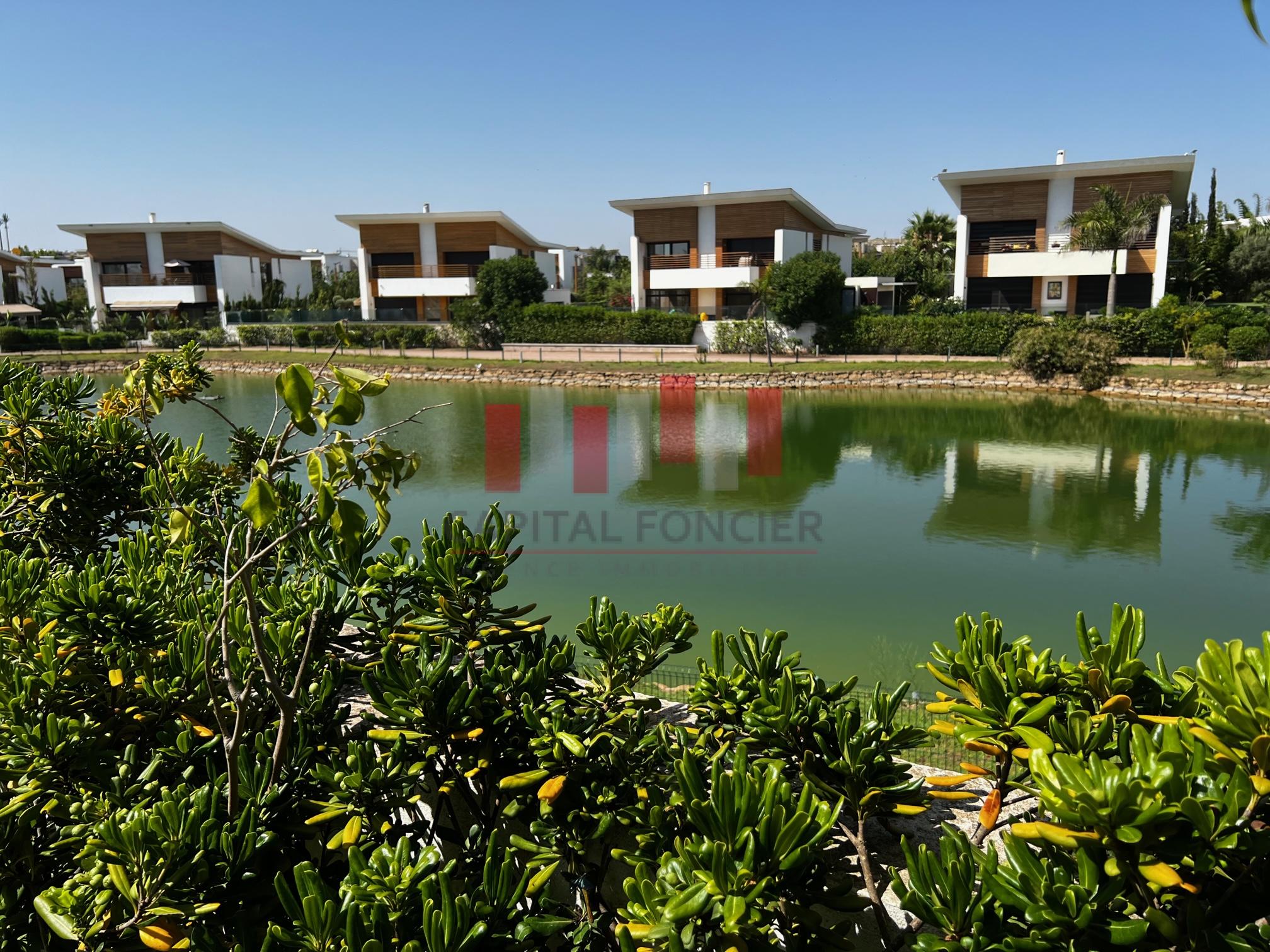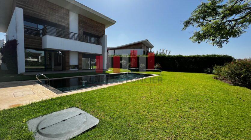 California Golf Resort -Ville verte – Bouskoura- Somptueuse villa isolée à louer vide , – 5 grandes chambres – 5 Salles de bain – Belle exposition : Sud – Vue imprenable sur le lac .