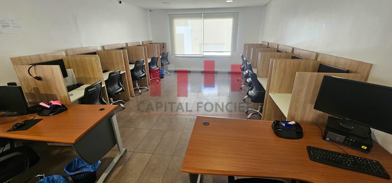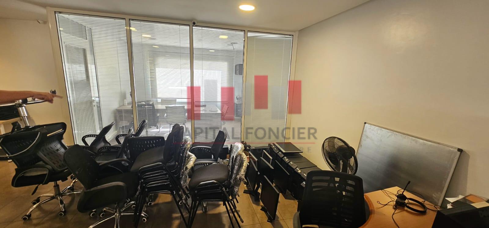 Capital Foncier vous propose à la location une surface de bureaux coté Twin Center de 95 m2 totalement aménagé et équipé avec 20 positions + salle de direction + Espace kitchenette + une place de parking incluse .