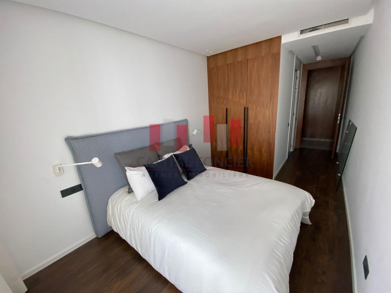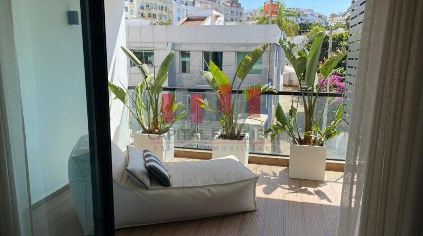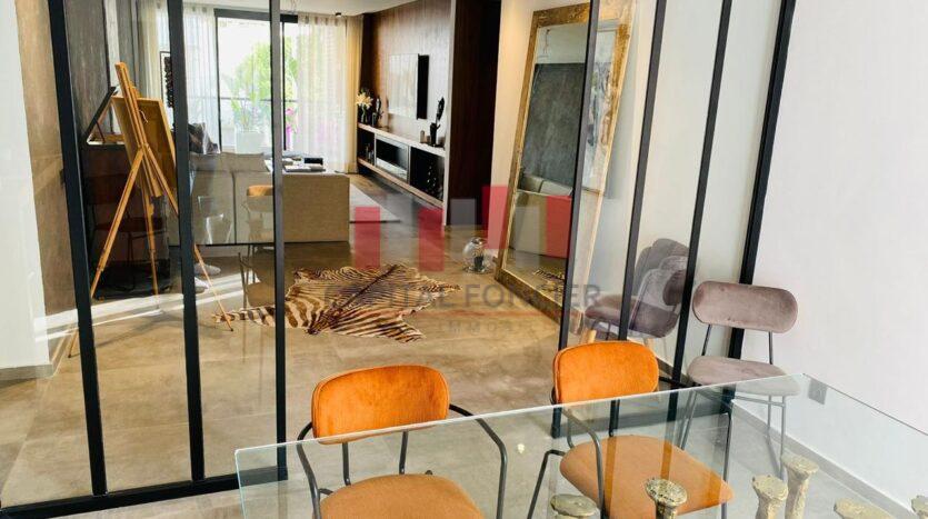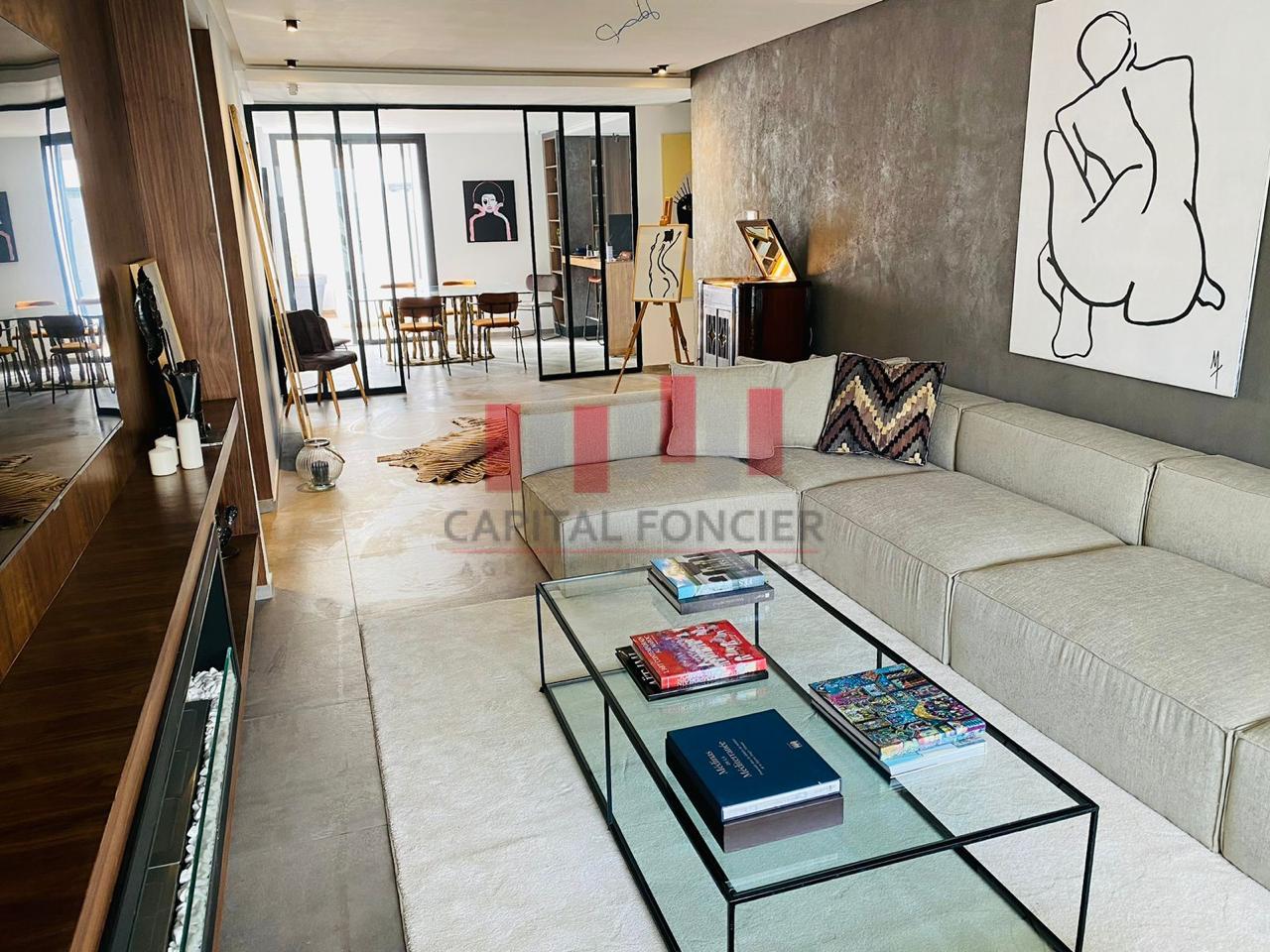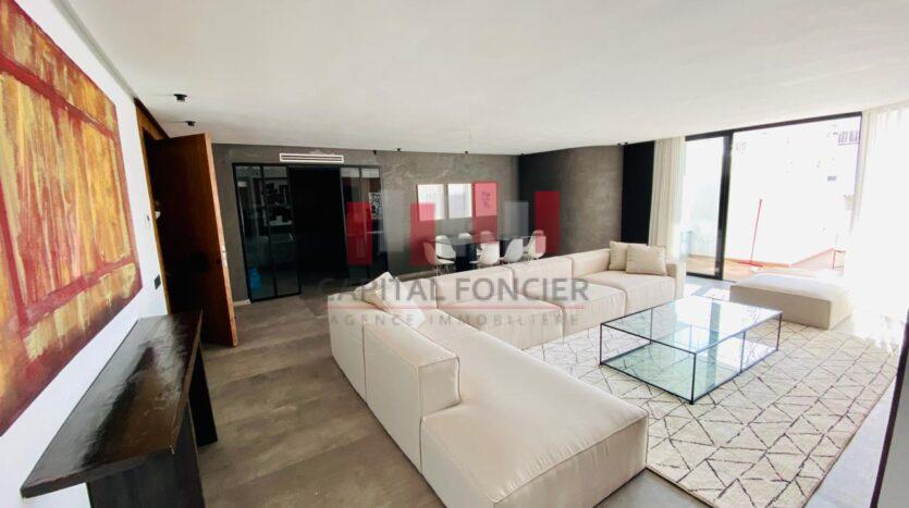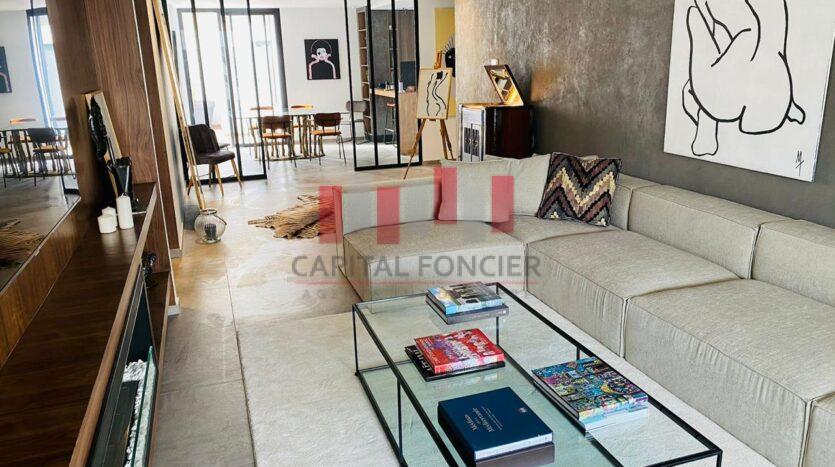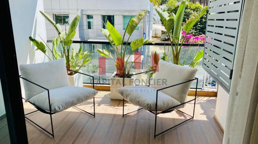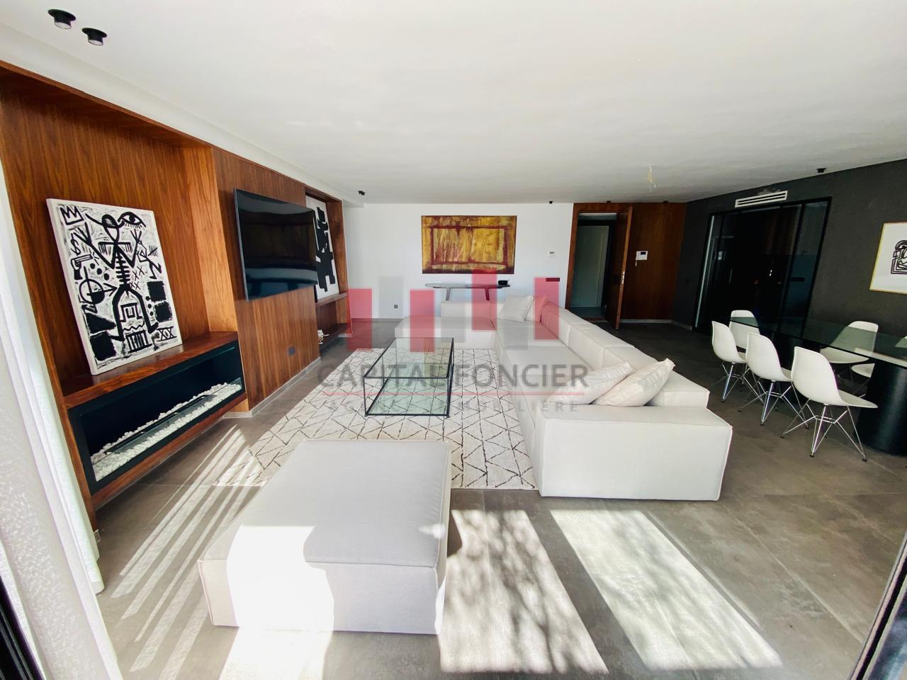PALMIERS : Appartement meublé sublime dans une belle résidence de haut standing avec un Roof top avec piscine et salle de sport d’une superficie de 147 m2 dont 27 m2 de terrasse. Il se compose d’un toilette invité, d’une cuisine semi ouverte attenante à la salle à manger, d’un salon avec une cheminée à l’ethanol, de 2 chambres avec dressing, de 2SDB, Climatisation centralisé, place de parking, prestations haut de gamme. Unique à Casablanca.