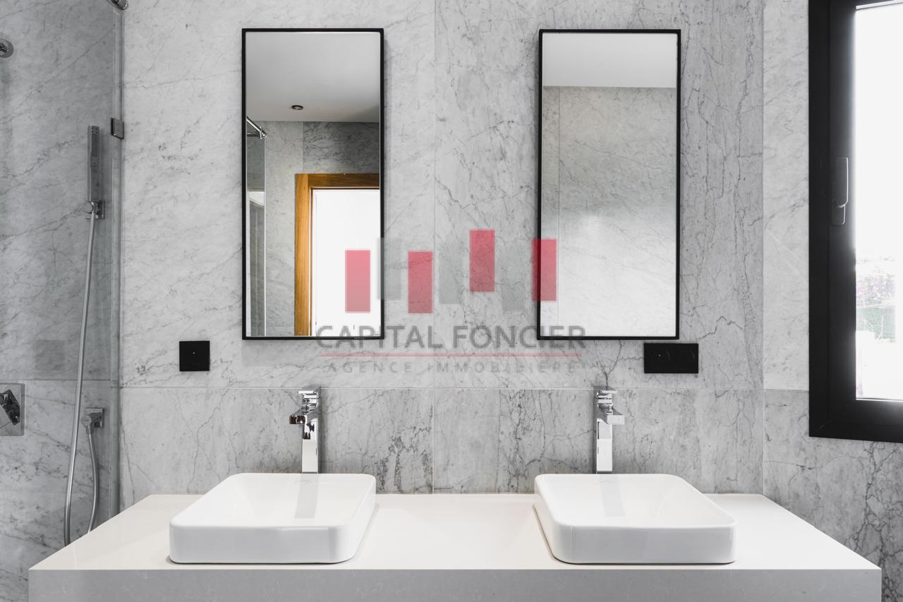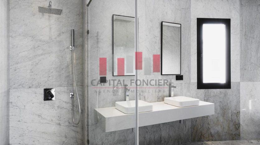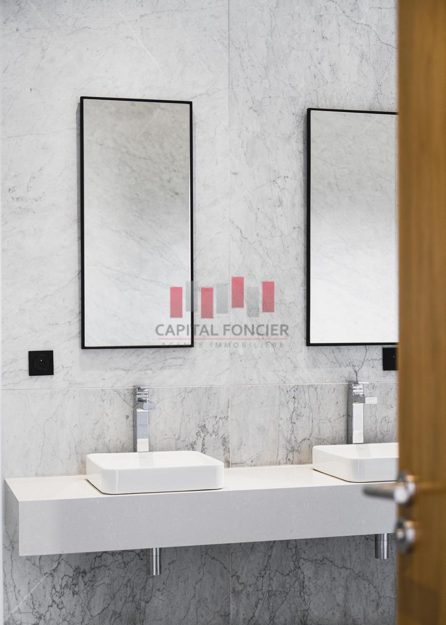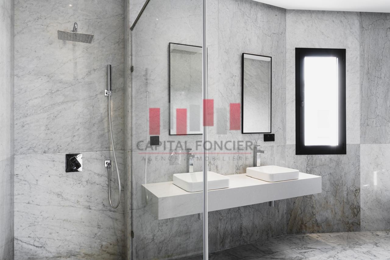 Finitions haut de gamme : marbre blanc de Carrare, portes en chêne clair, cuisine sur mesure.