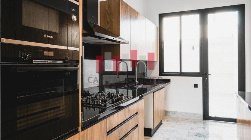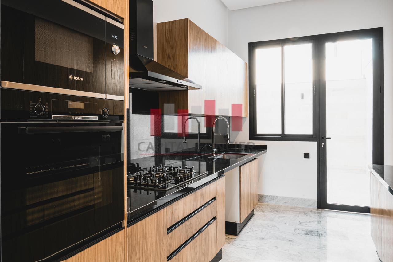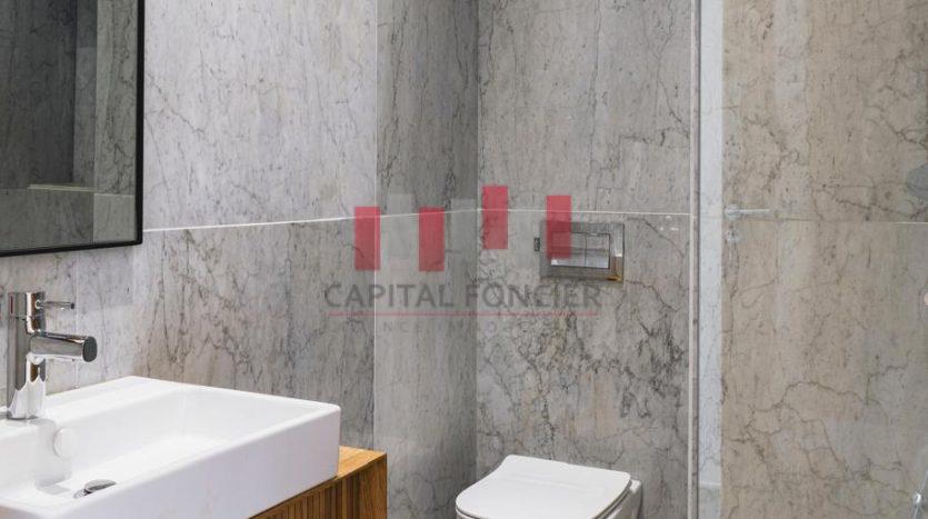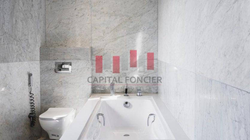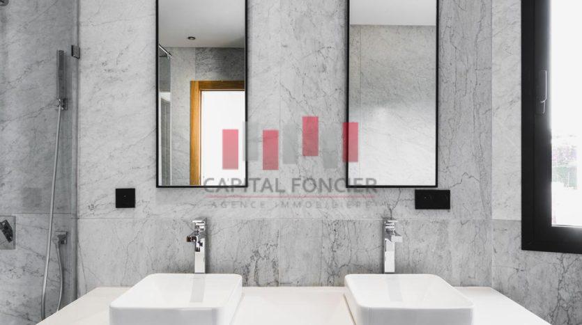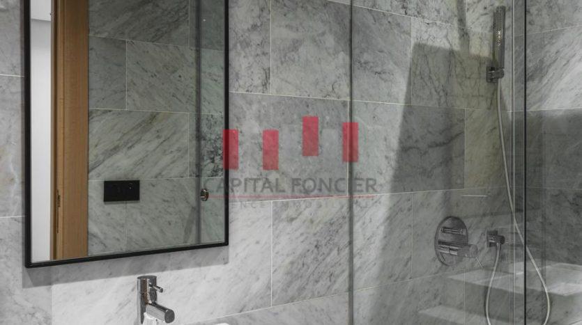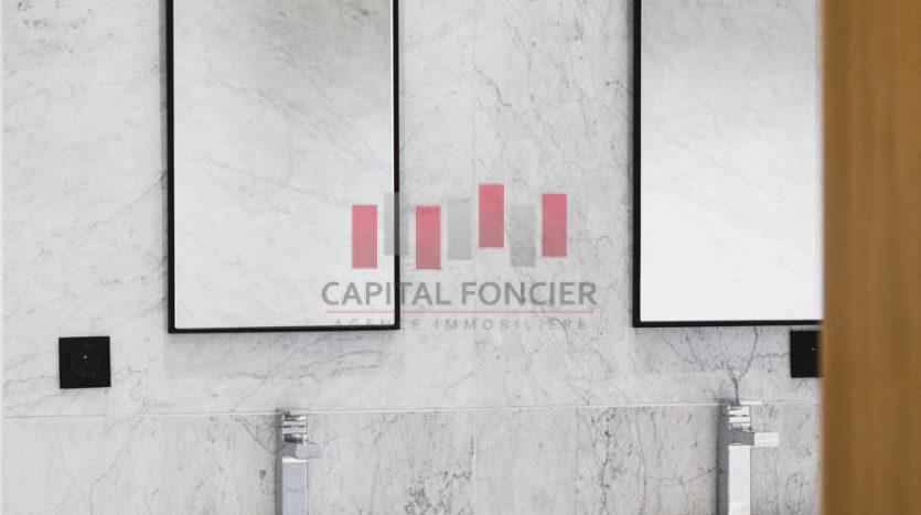 Finitions haut de gamme : marbre blanc de Carrare, portes en chêne clair, cuisine sur mesure.