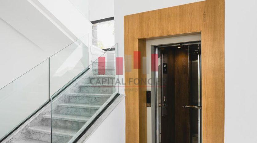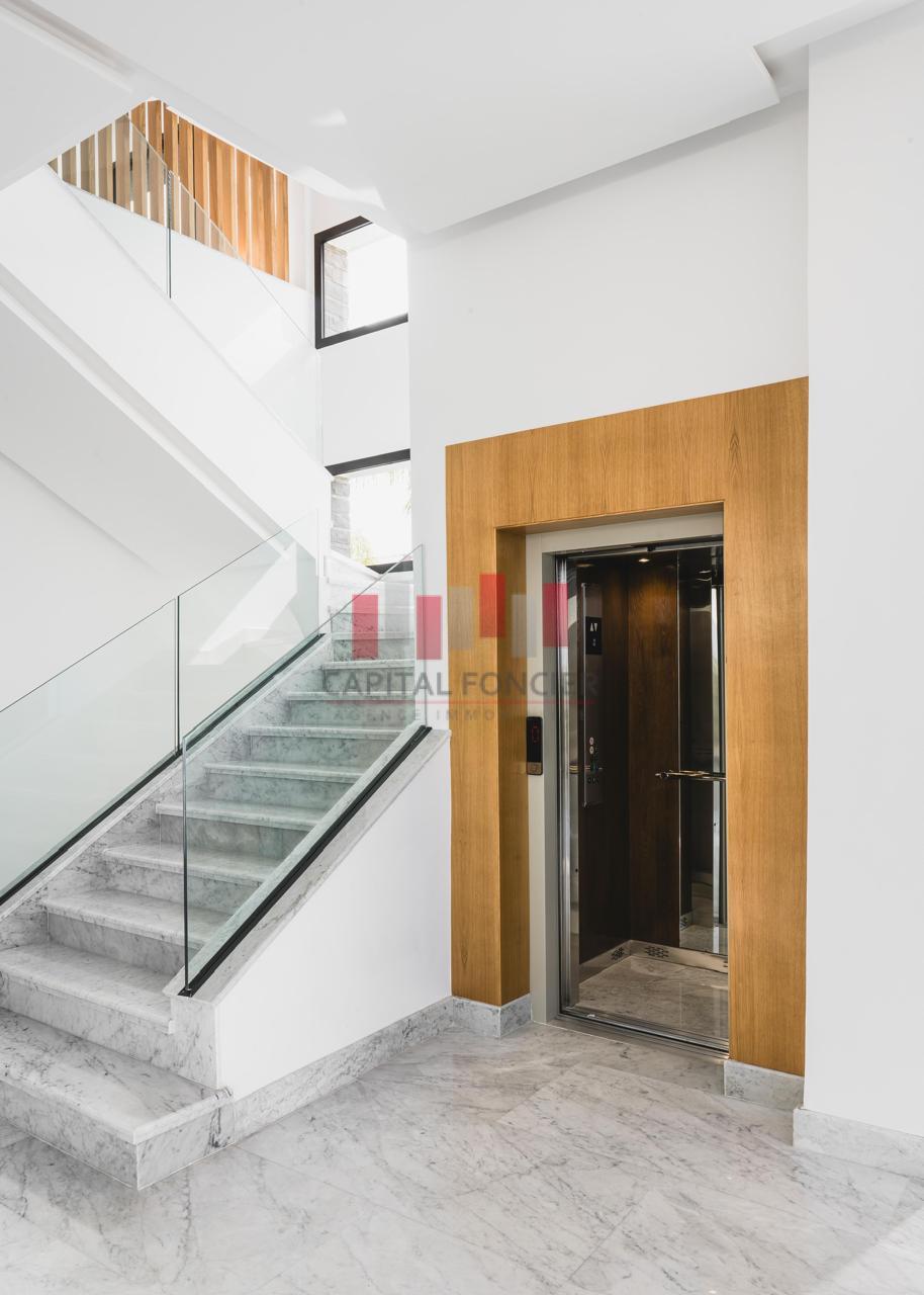 Un ascenseur dessert les trois niveaux, ainsi que le roof top qui dispose d’un panorama exceptionnel et qui est aménagé pour être équipé avec une cuisine d’appoint.