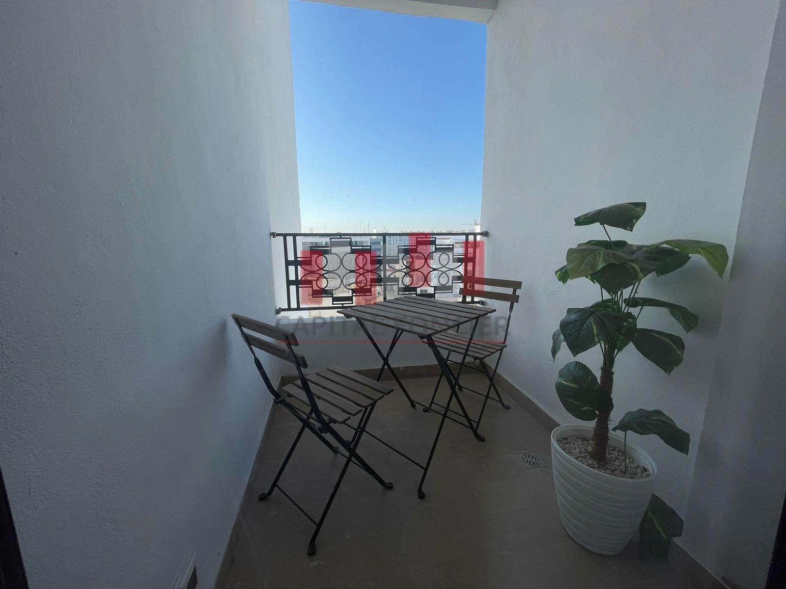 1 salon tres joliment meuble avec smart tele , internet et climatisation donnant un balcon