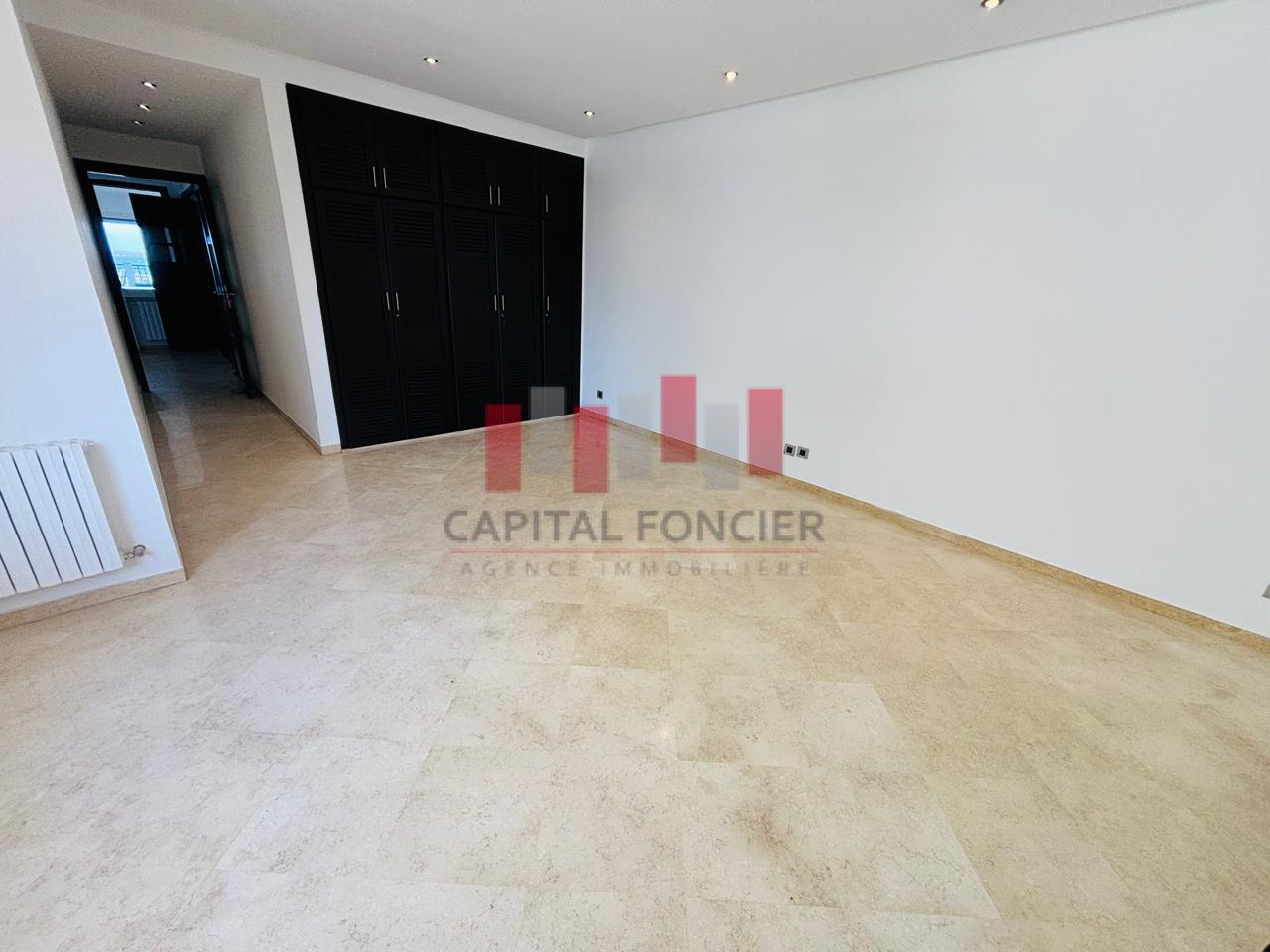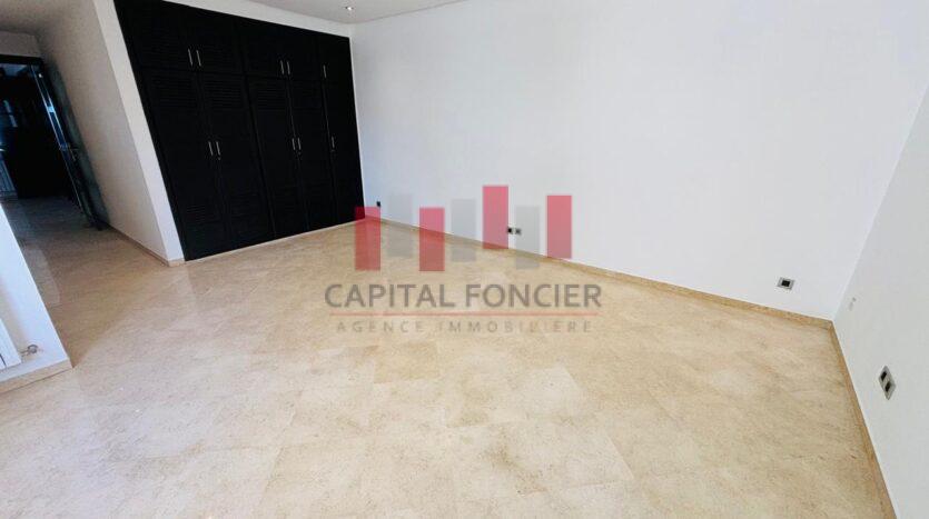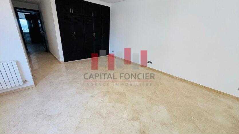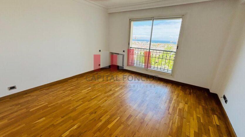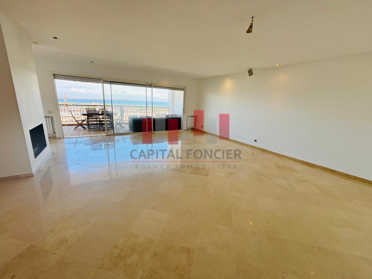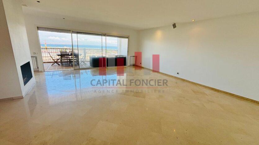 AIN DIAB ; apprêtement vide vue mer dans une résidence fermée avec piscine et salle de sport d’une superficie de 22à m2 dont 20 m2 de terrasse. Il se compose d’une grande suite parentale avec cheminée, d’une cuisine moderne totalement refaite, d’une chambre du personnel avec ses sanitaires, d’un toilette invité, de 3 chambres dont une suite parentale avec de nombreux rangements, de 2 sdb; Chauffage centrale, box privatif pour les voitures.