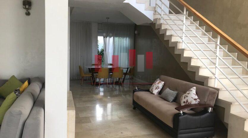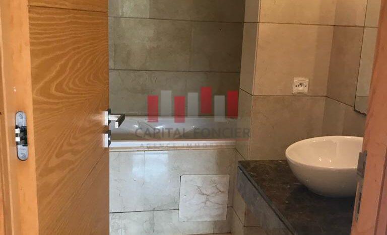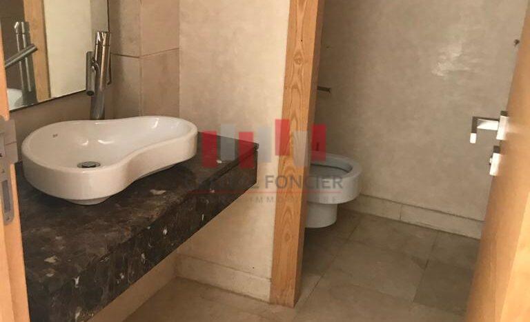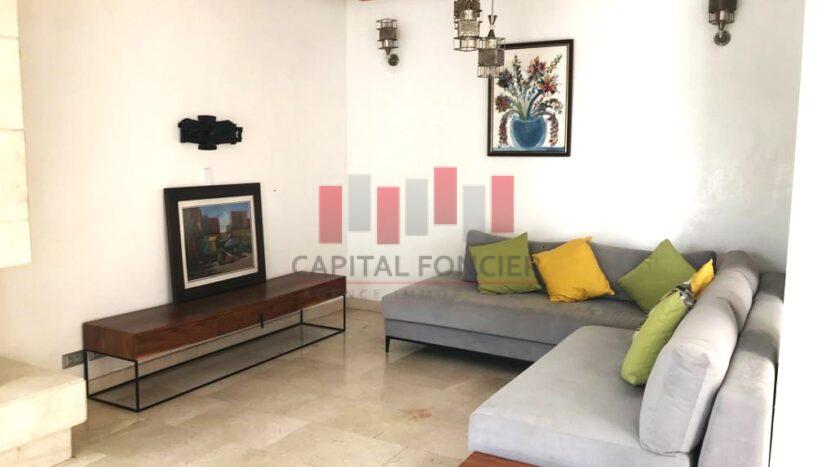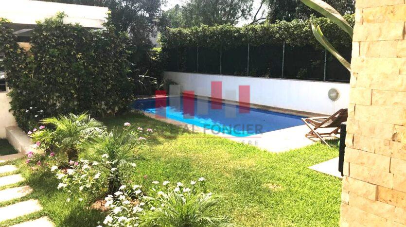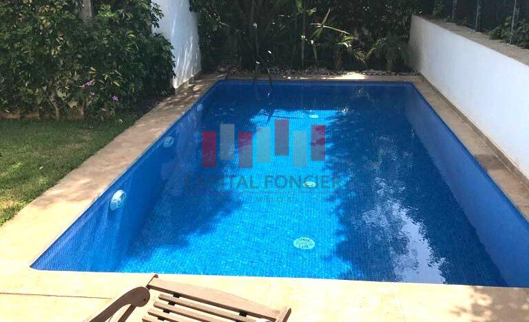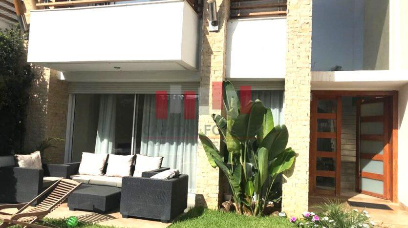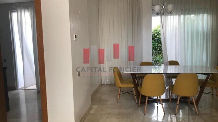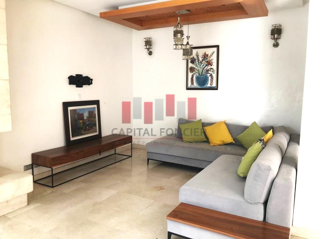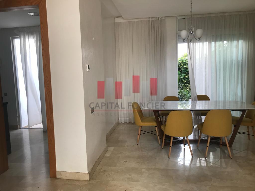 Très joli villa semi meublée , située dans une résidence fermée et sécurisée à Bouskoura , elle se compose d’un double salon avec coin cheminée donnant sur un jardin arboré avec piscine  , un coin salle à manger , une salle d’eau , et une cuisine entièrement équipée avec chambre de personnel . A l’étage 3 chambres dont la suite parentale avec dressing et salle de bain et deux autres chambres avec une salle de bain commune .
