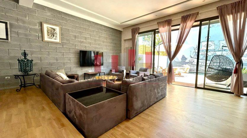 Une entrée donnant sur un triple séjour avec un coin salle à manger, un salon TV, ainsi que d’un coin cheminée. On y trouve également un WC invitée ainsi que d’une cuisine demi ouverte sur le séjour. Le séjour lui donne sur un très bel extérieur avec terrasse et piscine.